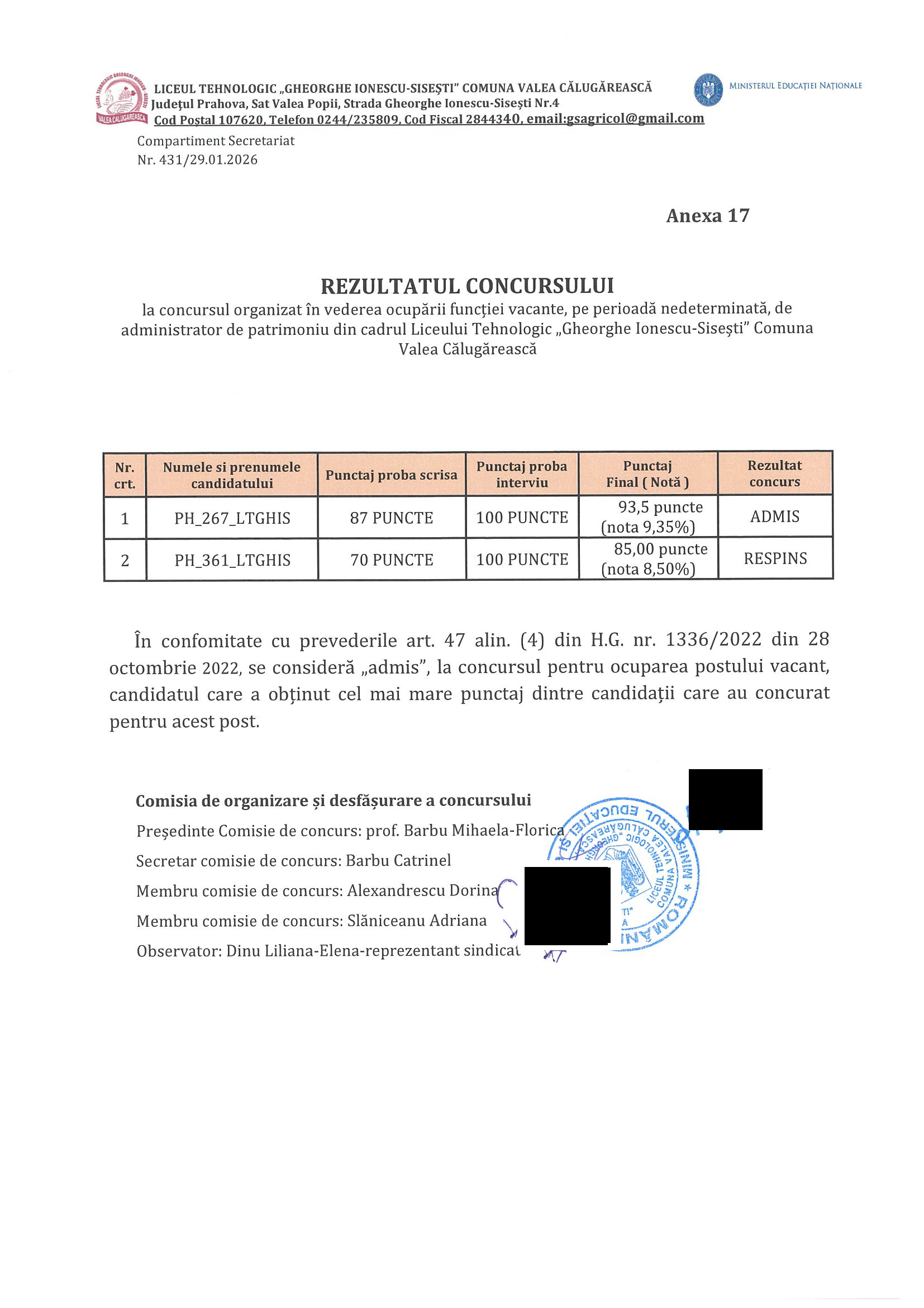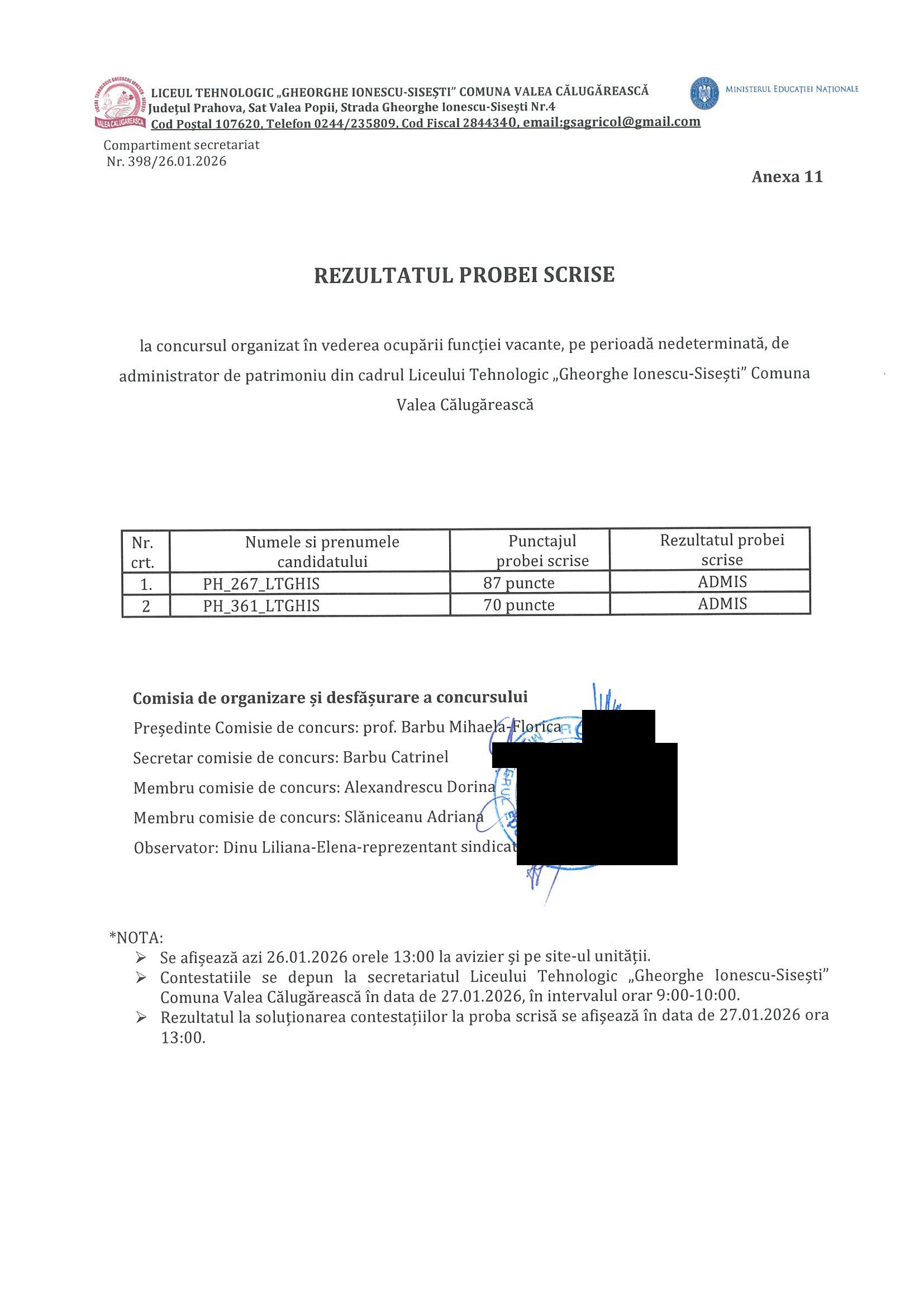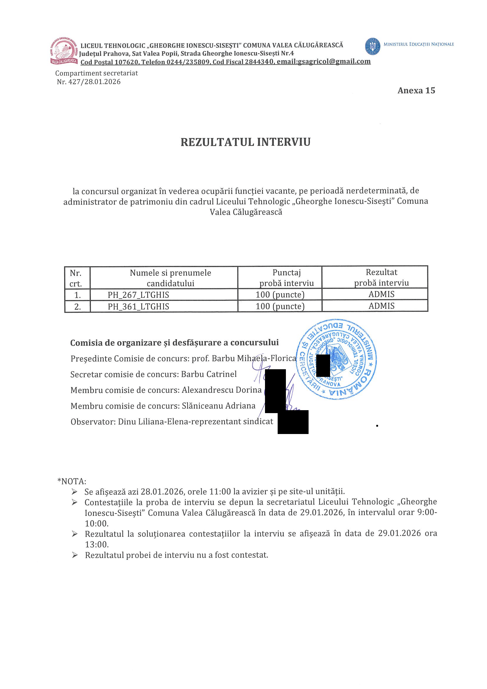 Rezultate proba interviu concurs ocupare post vacant Administrator de Patrimoniu